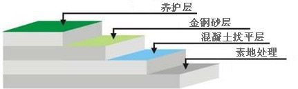 3. 金鋼砂層:先將2/3硬化劑(金屬骨料或非金屬骨料)均勻撒布,讓材料充分吸收混凝土中水份,用抹光機(jī)械抹平;再將余下1/3硬化劑均勻撒布,抹平。當(dāng)混凝土不被破壞時,再抹平,收光;