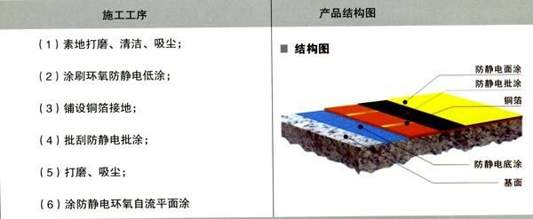 ⑤防靜電中涂:防靜電中涂將環(huán)氧樹脂加入適量的石英砂,用鏝刀將其均勻涂布數(shù)道;